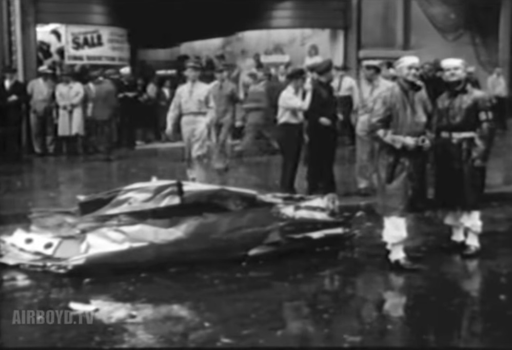 Below is part of the wreckage from a Mitchell B-25 bomber that landed in the street after the plane hit floors 78 and 79 of the Empire State Building in 1945 when it became lost in fog trying to land.
