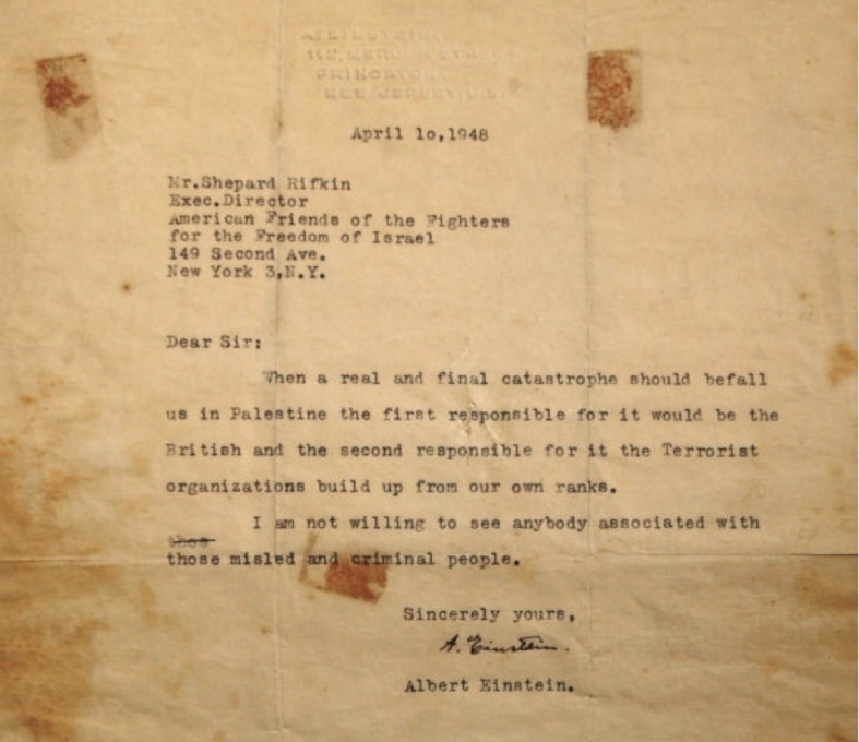 However, this view was not held by everyone who supported the birth of a Jewish State in Palestine. Although money was raised in the United States to support the terrorist groups of Irgun and LEHI (Stern Gang) through a group know as ‘American Friends of the Fighters for the Freedom of Israel’ in their bid to cleanse Israel of its Arab inhabitants and British occupiers, a rebuttal came from Albert Einstein when Mr. Shepard Rifkin, who was the executive director after the UN Partition of Palestine, requested his support for the Stern Gang’s activities. [15]